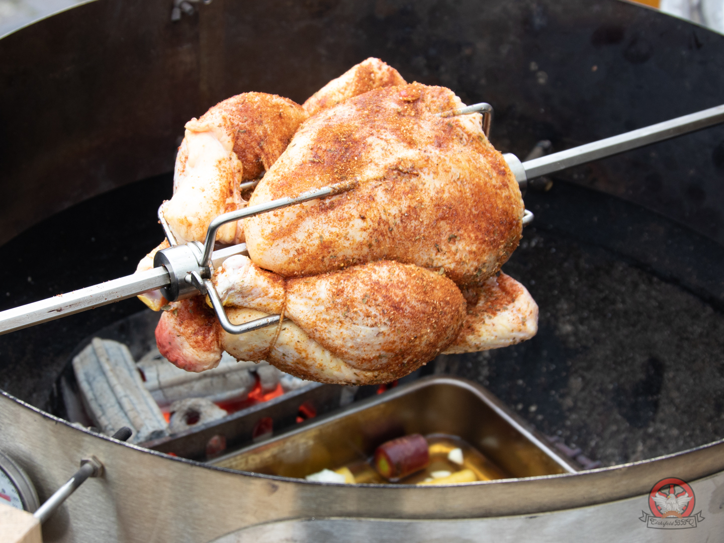 Nun war es Zeit für einen Test! Es sollte einen Sonntags-Hähnchen von nur 1,7 kg geben. Ich benötig dafür eine Temperatur von 200-220°C. Also entschied ich mich für einen dreiviertel vollen Anzündkamin (AZK).