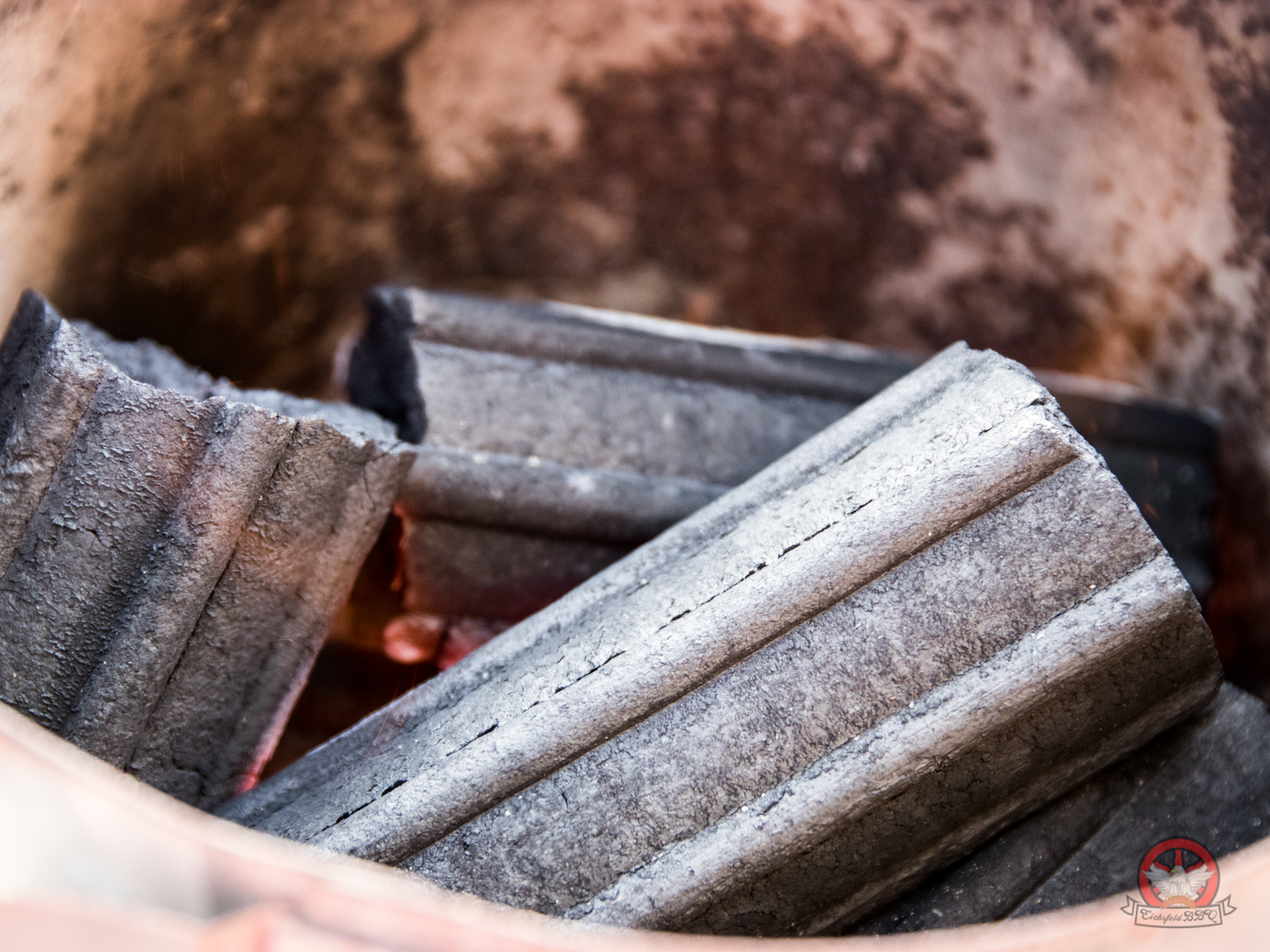 Die Kohle besteht –laut Hersteller- aus Spänen von Harthözern wie Buche und Eiche, aber kein Tropenholz! Sie ist frei von Bindemitteln und anderen Schadstoffen, und soll 4-6 Stunden bei bis zu 400°C gleichmäßig „brennen“.